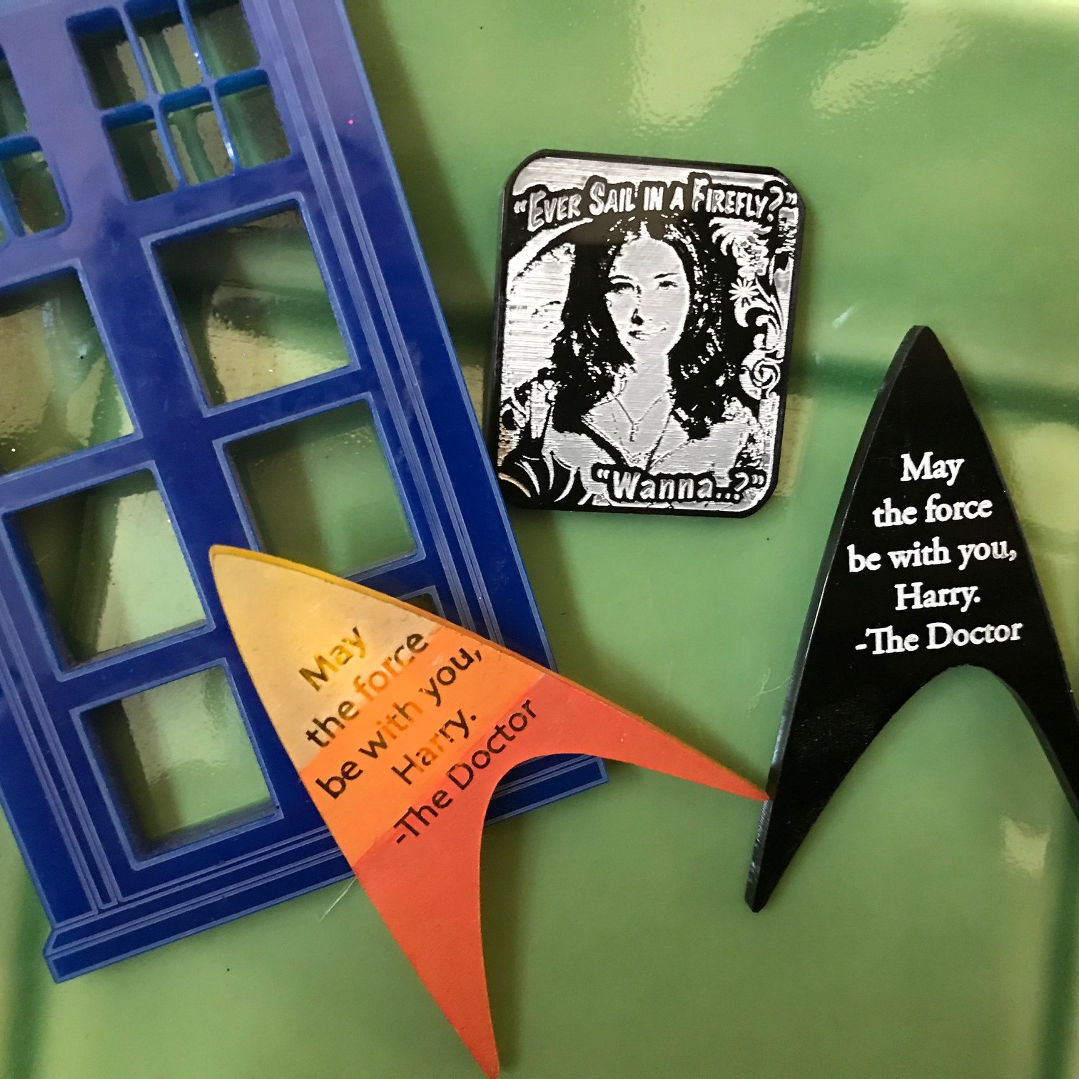 We can engrave or cut various materials including wood, acrylic, leather, metal, and paper. We can customize almost anything in your home, from light switch plates to photo frames. We also create rubber stamps! Need fabric to complete your project? We have several hundred bolts to choose from.